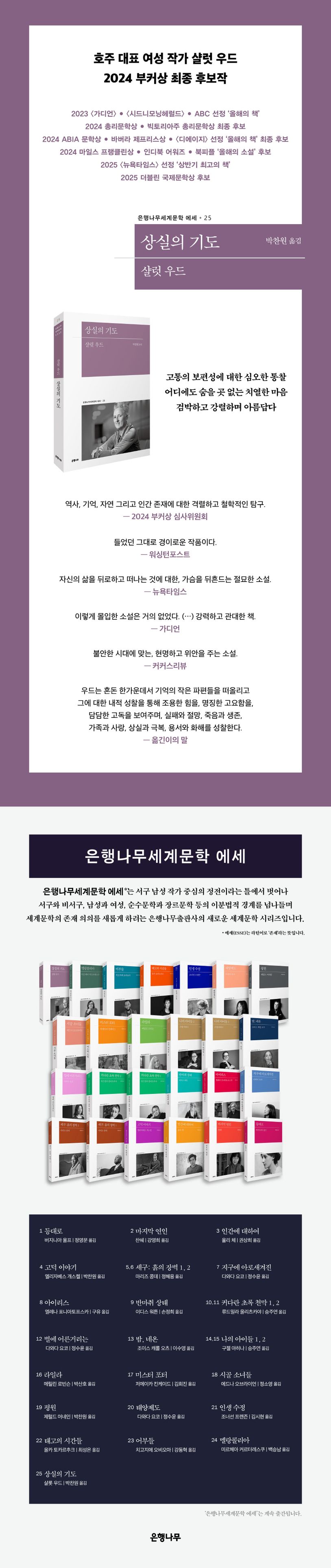 호주를 대표하는 여성 작가 샬럿 우드의 2024년 부커상 최종 후보작 《상실의 기도》(Stone Yard Devotional, 2023)가 은행나무세계문학 에세 25권으로 출간됐다. 이번에 처음으로 국내에 번역·소개되는 우드는 현대 호주 문학계의 새로운 흐름을 이끌어가는 가장 독창적이고 도발적인 작가로 알려져 있다.
