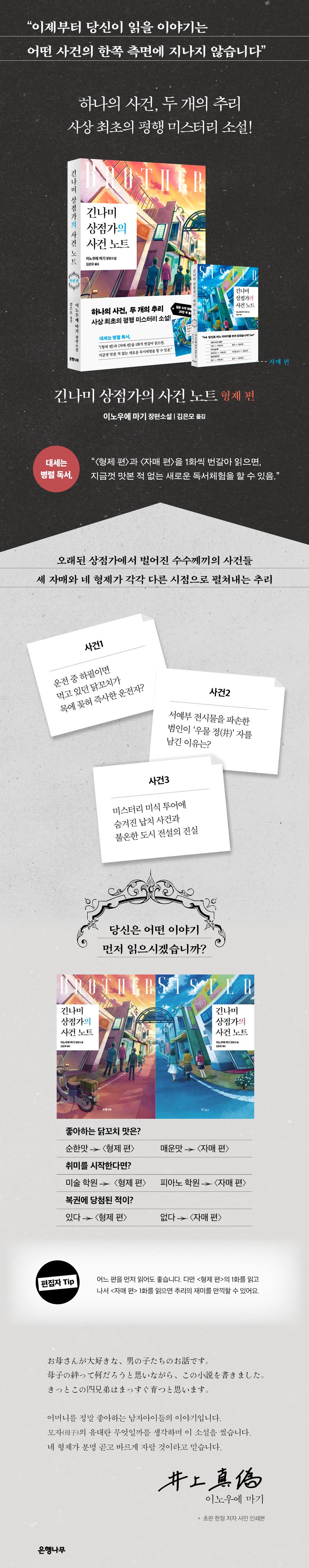 지금껏 본명도, 나이도, 성별도, 얼굴도 공개하지 않은 채 필명으로만 활동하는 ‘복면작가’ 이노우에 마기의 미스터리 소설 《긴나미 상점가의 사건 노트》가 ‘형제 편’과 ‘자매 편’ 두 권으로 출간되었다. 이 작품은 두 권의 책이 병행하여 이야기가 진행된다. ‘형제 편’과 ‘자매 편’의 1화부터 3화까지 서로서로 1화씩 링크가 되어 있는 것이다.전시물을 파손한 범인이 ‘우물 정(井)’ 자를 남긴 소소한 사건부터 먹고 있던 닭꼬치가 목에 꽂혀 죽은 운전자 사건과 미스터리 미식 투어에 숨겨진 납치 사건까지, 한때 번성했던 거리 ‘긴나미 상점가’에서 수수께끼 같은 일들이 벌어진다. 이를 여성과 남성의 시점으로 각각 추리해나가는데, 사건은 같지만 드러나는 진상은 완전히 다르다.때문에 ‘형제 편’과 ‘자매 편’을 1화씩 번갈아 읽으면, 하나의 사건에 두 개의 진실이 감춰져 있는 평행 미스터리 소설의 묘미를 만끽할 수 있다. 《긴나미 상점가의 사건 노트》는 두 출판사의 공동 출판 프로젝트로 은행나무 출판사에서 ‘형제 편’을, 북스피어 출판사에서 ‘자매 편’을 출간하였으며 어느 쪽 이야기를 먼저 봐도 상관없도록 제작되었다.