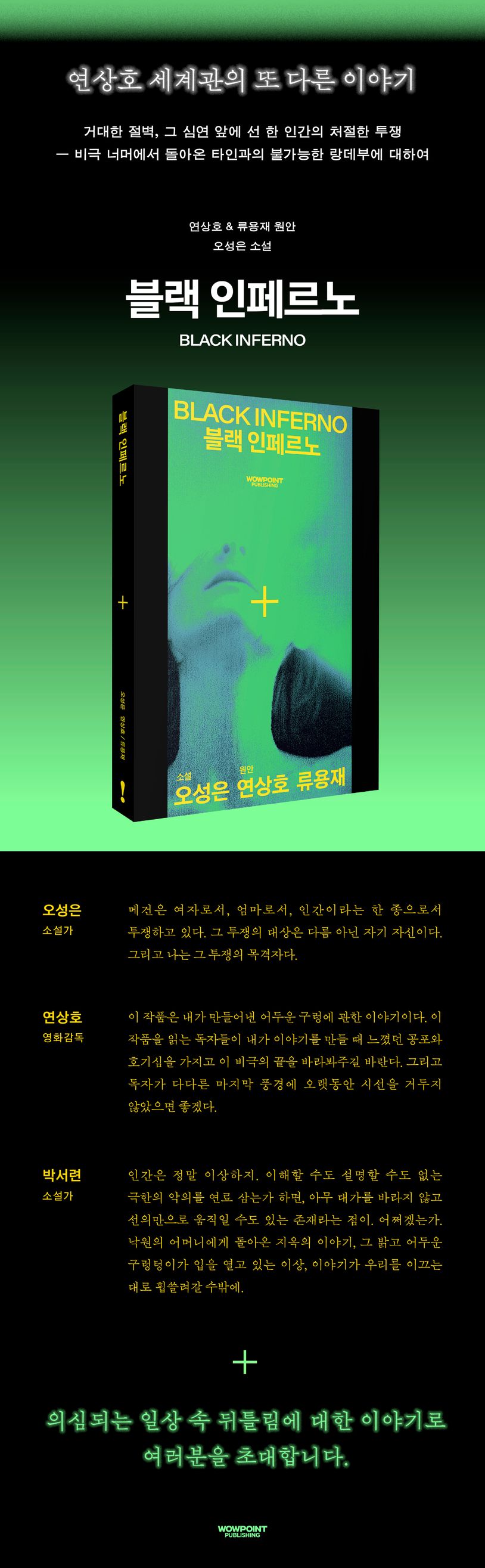 거대한 절벽을 마주한 한 인간의, 여성의, 어머니의 처절한 투쟁을 보여주는 서스펜스 스릴러 《블랙 인페르노》가 글로벌 콘텐츠 제작사 와우포인트와 은행나무출판사의 협업 임프린트 ‘와우포인트 퍼블리싱’에서 출간되었다. 첫 번째 프로젝트 도서 《지옥: 신의 실수》에 이은 두 번째 도서이다. 영화 〈부산행〉과 넷플릭스 시리즈 〈지옥〉 등을 통해 고유한 세계관 속 이야기를 전해온 연상호 감독과 그와 함께 〈반도〉부터 손발을 맞춰온 류용재 작가의 원안을 바탕으로, 소설 《라스팔마스는 없다》를 통해 ‘천재적 감각성’의 소설가라는 찬사를 받은 오성은 소설가가 집필에 나섰다. 역작의 탄생 순간이다.