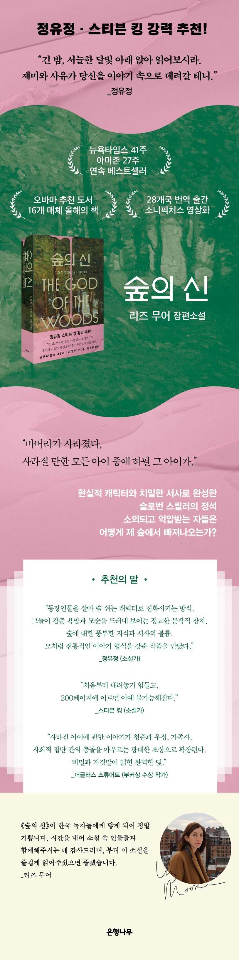 리즈무어는대중성과깊이를겸비한작가로,최근작《숲의신》이밀리언셀러를기록하고전세계28개국에출간되면서세계적인작가로서의명성을공고히했다.그의작품들은주로사회적맥락속에서훼손된인간성에주목한다.또한개인의경험이나실제사건을바탕으로온정어리면서도명민한통찰이담긴허구를창조해내는것이특징이다.예컨대《보이지않는세계》에서는물리학자의자녀로서의경험을인간성의경계에대한질문으로확장했으며,《길고빛나는강》은미국이직면한오피오이드마약위기를긴장감넘치는범죄소설로풀어냈다.《숲의신》역시실제미제실종사건과악명높은연쇄살인범을모티프로,흥미진진한스릴러문법안에서일그러진사회의서늘한민낯을고발한다.