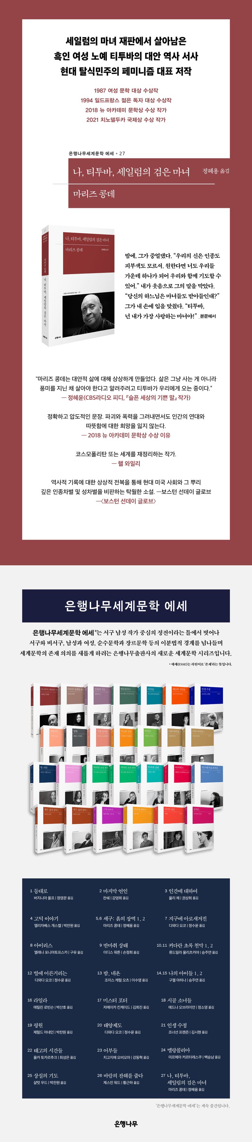 이렇게 세상에 단 한 번 존재하고 단 한 번 수여된 ‘뉴 아카데미 문학상’을 수상한 유일한 작가 마리즈 콩데의 《나, 티투바, 세일럼의 검은 마녀》가 은행나무세계문학 에세 27권으로 출간됐다. 현대 탈식민주의 문학의 거장으로서 카리브해 문화와 정치에 영향을 끼친 그의 대표작이다.