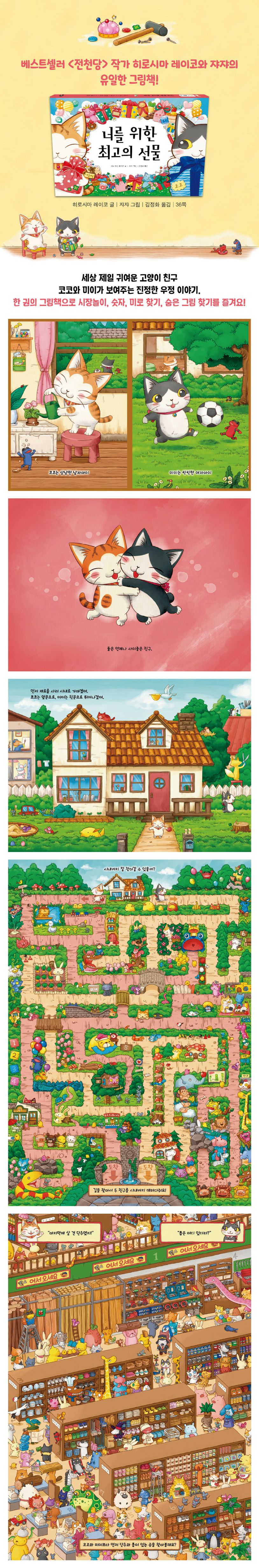 베스트셀러 작가인 히로시마 레이코와 쟈쟈가 함께 작업한 유일하고 특별한 그림책 『너를 위한 최고의 선물』이 출간되었다. 이 책은 그동안 작가들이 선보였던 판타지 속 스릴러 느낌이 아닌 아름답고 사랑스러운 글과 그림으로 어린이뿐만 아니라 어른들도 동심의 세계로 여행을 떠나게 해주기에 충분하다. 『너를 위한 최고의 선물』은 친구 사이의 우정이라는 큰 주제 아래 숨은 그림 찾기, 미로 찾기, 숫자 세기, 시장놀이 등 다양하고 재미있는 장치가 책 속 곳곳에 숨어 있어 어린이 독자들의 마음을 사로잡는다. 또 한 주인공들의 성별을 통해 남자와 여자 그에 따른 고정관념을 주입시키는 것이 아닌, 올바른 성인지 감수성을 심어줄 수 있으며 그 이상의 메시지에 귀 기울이게 되는 그림책이다.