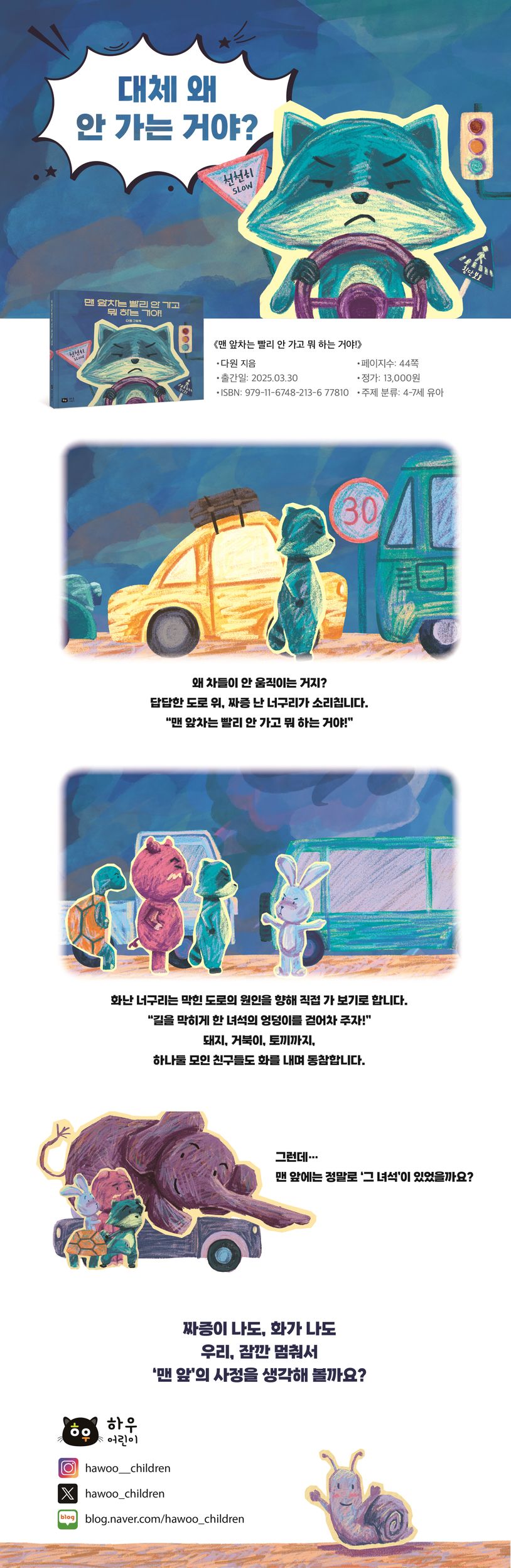 답답하게 막힌 도로, 너구리는 앞차가 움직이지 않아서 짜증이 납니다. 도대체 언제쯤 이 차들이 움직이기 시작할지……. 결국 너구리는 이 체증의 원인을 직접 가서 혼내주겠다며 차에서 내리죠. 아마도 돼지가 앞을 막고 있으리라고 생각하며 씩씩대면서 가지만, 웬걸, 돼지도 막히는 길 가운데 있었습니다. 그렇게 하여 너구리와 돼지, 거북이와 토끼가 이 막히는 길의 원인 제공자를 찾아 앞으로 향합니다. 동물 친구들은 단호하게 외치죠.