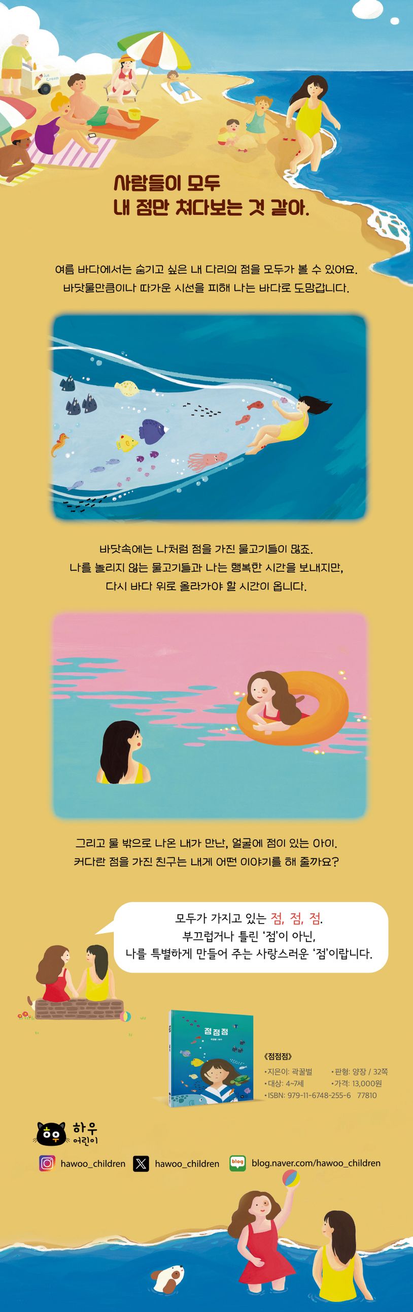 ‘나’는 다리에 있는 점이 신경 쓰입니다. 남들이 그걸 쳐다보는 것도 싫어요. 그래서 여름이 오고, 바다에 놀러 가는 게 마음에 들지 않습니다. 수영복을 입으면 감추고 있던 나의 비밀이 모두 드러나니까요. 바다에 온 ‘나’는 사람들의 따가운 시선을 피해 바다로 숨어듭니다.
