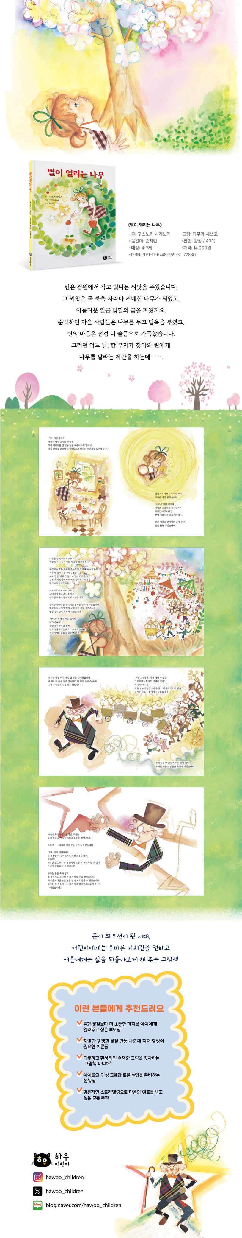 어느 맑은 아침, 외톨이 소녀 린은 정원에서 무지갯빛으로 반짝이는 씨앗 하나를 발견했습니다. 호기심에 심은 씨앗은 하루가 다르게 쑥쑥 자라더니, 한 달 만에 이웃 마을에서도 보일 만큼 거대한 나무가 되었지요. 나무가 일곱 빛깔의 신비로운 꽃을 피우자, 린의 마을에는 꽃을 구경하려는 수많은 사람이 몰려들었습니다. 조용하던 시골 마을은 순식간에 시끌벅적한 장터로 변했습니다. 마을 사람들은 밭을 일구는 대신 장사를 시작했고, 돈 버는 재미에 빠져 서로 다투기 시작했습니다. 꽃이 진 자리에 ‘불로장생의 약’이라 불리는 별 열매가 맺히자, 탐욕은 극에 달합니다. 도시의 큰 부자가 나타나 마을의 집과 밭을 모조리 사들이고 사람들을 쫓아내 버린 것이죠. 이제 마을에 남은 건 나무를 지키려는 어린 린과, 욕망에 눈이 멀어 하늘 높은 줄 모르고 사다리를 오르는 부자뿐입니다.