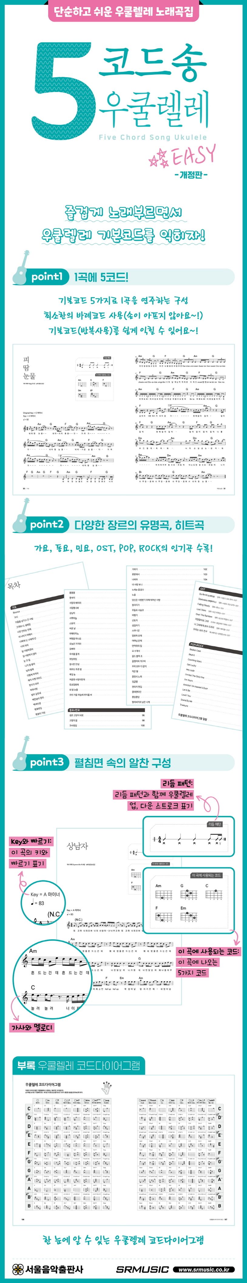 이 책은 5(파이브)코드, 다섯 가지 이하의 코드로 우쿨렐레를 연주하며 노래하기에 좋은 93곡을 엄선한 우쿨렐레 노래곡집이다. 가요, 동요&민요, OST, POP&ROCK의 카테고리로 구분된 유명한 곡들을 쉬운 코드로 바로 연주해볼 수 있다. 기타를 입문해 기본적인 코드를 익힐 때에도 좋고, 알고 있는 몇 가지 코드만으로 유명한 곡을 연주해볼 수 있어 초보자에게 유용한 악보집이다.