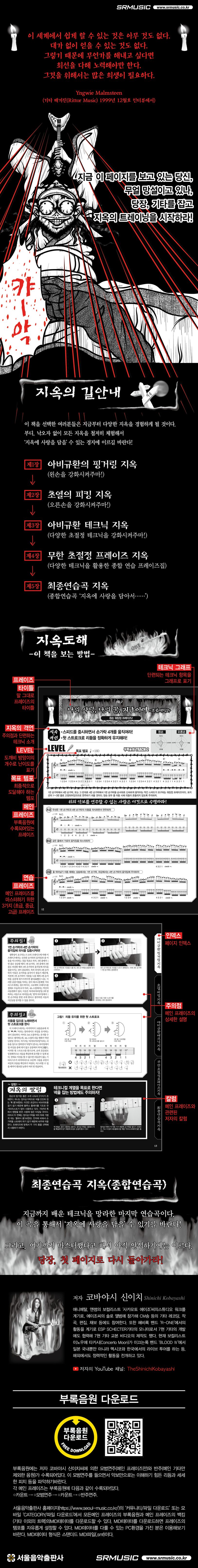 2007년 출간 이후, 일렉트릭 기타의 입문서로 자리 잡은 〈지옥의 메커니컬 기타 트레이닝〉의 첫 번째 책이자 가장 높은 난이도의 책이다. 왼손의 핑거링 강화는 물론, 오른손의 피킹 강화, 기타 테크닉 강화, 초절정 프레이즈 등 폭넓은 내용이 담겨 있다. 또한 펼친면 2페이지 안에 하나의 엑서사이즈 해설, 그리고 메인이 되는 난관 프레이즈 외에 연습 프레이즈가 3가지 수록되어 있어 초보자도 연습이 가능하다. QR코드로 다운로드 가능한 부록음원에는 모범연주가 수록되어 있어서 악보만으로는 알기 힘든 리듬이나 세세한 뉘앙스 등을 파악할 수 있다. 제대로 된 연주 테크닉을 익히고 싶은 분은 꼭 읽어보아야 하는 일렉트릭 기타의 체르니 같은 존재다.