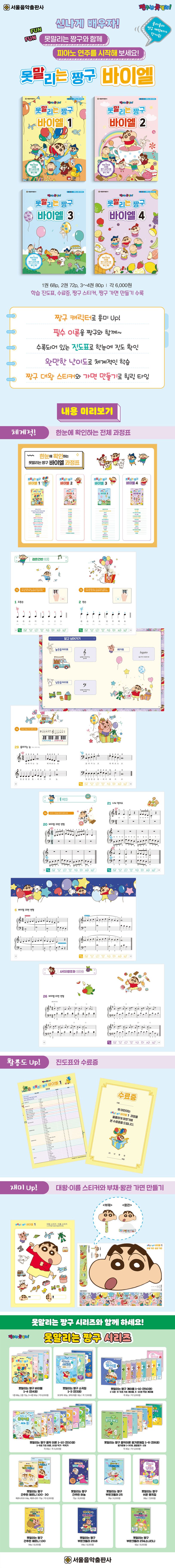 남녀노소가 좋아하는 짱구 캐릭터로 쉬운 바이엘이 출간되었습니다. 무선악보로 시작하여 바이엘 과정에 맞춘 연습곡들, 재미난 가사의 곡들을 수록하여 6세부터 시작할 수 있는 피아노 기초 교본입니다. 일반적인 바이엘 과정에서 겪는 어려움들을 아이들의 눈높이에 맞춰 완만한 난이도로 즐겁게 배울 수 있도록 하였고, 피아노를 시작할 때 꼭 배워나가야 할 기초 음악 이론 개념을 수록하여 실력을 더욱 탄탄하게 할 수 있습니다. 선생님의 편의를 위한 학습 과정표, 진도표, 연습 체크와 아이들의 흥미를 이끌 수 있는 스티커, 가면 만들기 등 다양한 구성을 통해 꾸준하게 바이엘 전4권의 과정을 마칠 수 있습니다.