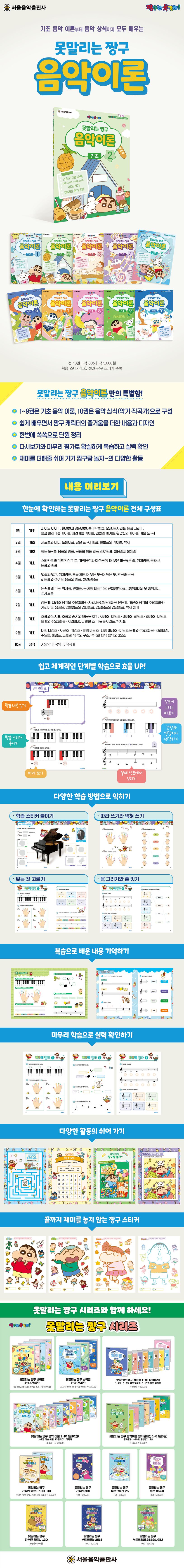 남녀노소가 좋아하는 짱구 캐릭터로 쉬운 기초 음악 이론이 출간되었습니다. 피아노 연주에 꼭 필요한 음악이론의 첫 시작부터 난이도에 맞춰 쉽고 체계적으로 배울 수 있게 구성하였습니다. 1권은 학습 스티커로 글쓰기에 익숙하지 않은 6~7세부터 사용 가능합니다. 또한 다시보기, 한번에 쏙쏙, 마무리 평가 3회를 통해 배운 내용을 완벽하게 익힐 수 있고, 귀여운 짱구와 함께 재미를 더해줄 쉬어가기의 다양한 활동과 흥미를 이끌 수 있는 짱구 스티커가 수록되어 있습니다.
