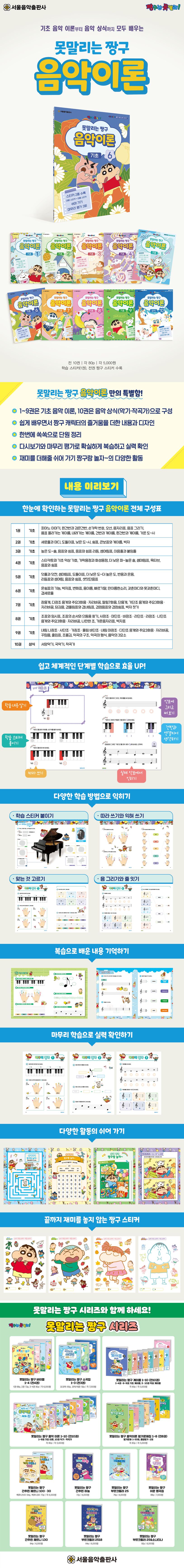 남녀노소가 좋아하는 짱구 캐릭터로 쉬운 기초 음악 이론이 출간되었습니다. 피아노 연주에 꼭 필요한 음악이론의 첫 시작부터 난이도에 맞춰 쉽고 체계적으로 배울 수 있게 구성하였습니다. 1권은 학습 스티커로 글쓰기에 익숙하지 않은 6~7세부터 사용 가능합니다. 또한 다시보기, 한 번에 쏙쏙, 마무리 평가 3회를 통해 배운 내용을 완벽하게 익힐 수 있고, 귀여운 짱구와 함께 재미를 더해줄 쉬어가기의 다양한 활동과 흥미를 이끌 수 있는 짱구 스티커가 수록되어 있습니다.