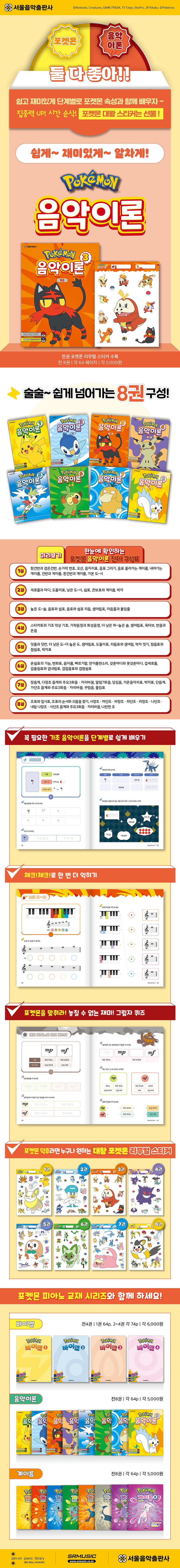 인기 캐릭터 포켓몬스터와 함께하는 기초 필수 음악이론 공부로 1권부터 8권까지 전 8권 구성입니다. 전 8권 구성으로 음악이론을 보다 쉽게 재미있게 익힐 수 있도록 구성된 교재입니다. 전권 대왕 포켓몬 리무벌 스티커와 이름 스티커 총 80여종의 띠부실을 수록하여 더욱 특별하고 다양한 포켓몬스터를 만나볼 수 있습니다.