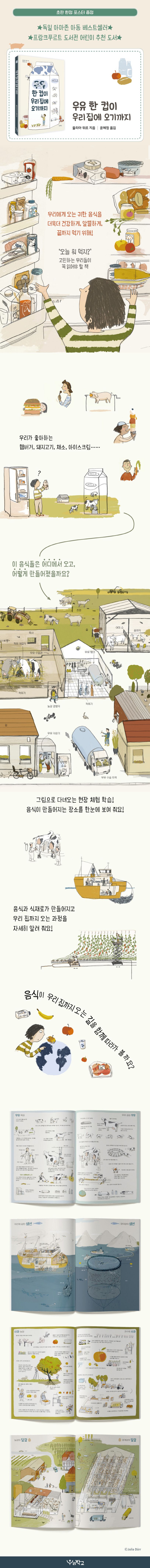 『우유 한 컵이 우리 집에 오기까지』는 음식이 우리 식탁에 오르기까지의 과정을 섬세하고 부드러운 그림으로 알려 주는 교양 그림책으로, 우리 식탁에 자주 오르는 고기, 생선, 과일, 달걀 등 여러 식자재가 생산, 유통되는 과정을 한눈에 보여 준다. 저자가 직접 현장 답사를 다니며 지은 이 그림책은 생생한 현장감을 전달해 주면서, 음식에 대한 정보와 더불어 노동력과 기후, 환경, 동물권까지 찬찬히 생각해 볼 수 있도록 돕는다. 독일 프랑크푸르트 도서전에서 어린이 논픽션 그림책 추천 도서로 선정, 수많은 언론의 호평을 받았다.