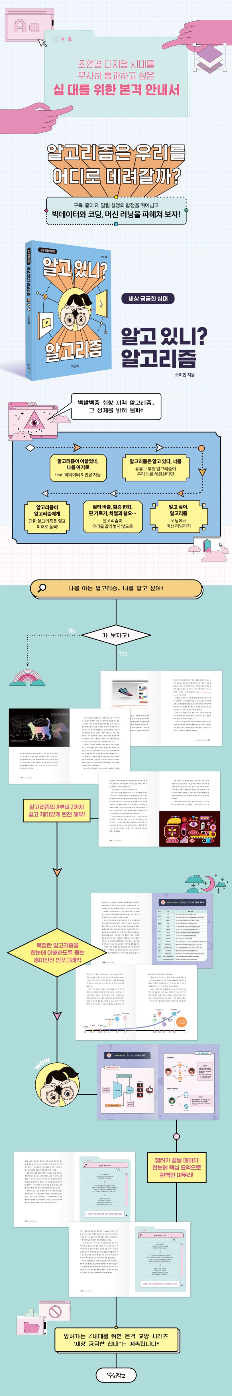 자고 일어나면 달라지는 세상, 더 나은 미래를 한발 앞서 준비하고자 하는 Z세대를 위한 본격 교양 시리즈 〈세상 궁금한 십대〉의 두 번째 책 『알고 있니? 알고리즘』이 출간되었다. 오늘날 우리 일상 속 언제 어디에나 있는 알고리즘이 도대체 무엇이고 어떤 원리로 작동하는지, 어떤 한계와 문제점을 지녔고, 이를 어떻게 풀어 나가야 할지를 한 권에 담았다.