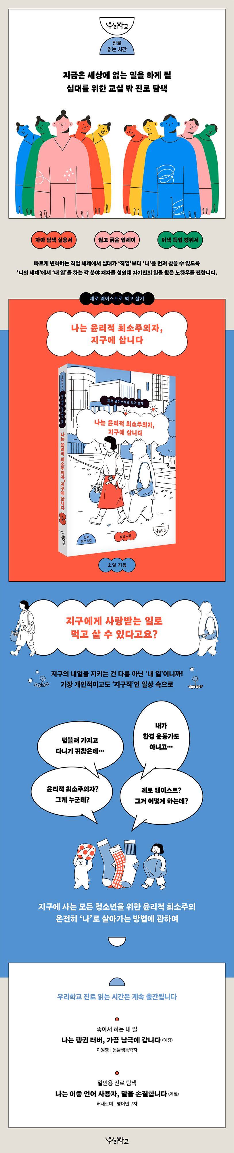 예측할 수 없을 만큼 빠르게 변화하는 직업 세계를 맞닥뜨린 십대를 위한 새로운 진로 탐색 시리즈 [우리학교 진로 읽는 시간] 시리즈의 첫 번째 책 『나는 윤리적 최소주의자 : 지구에 삽니다』가 출간되었다.