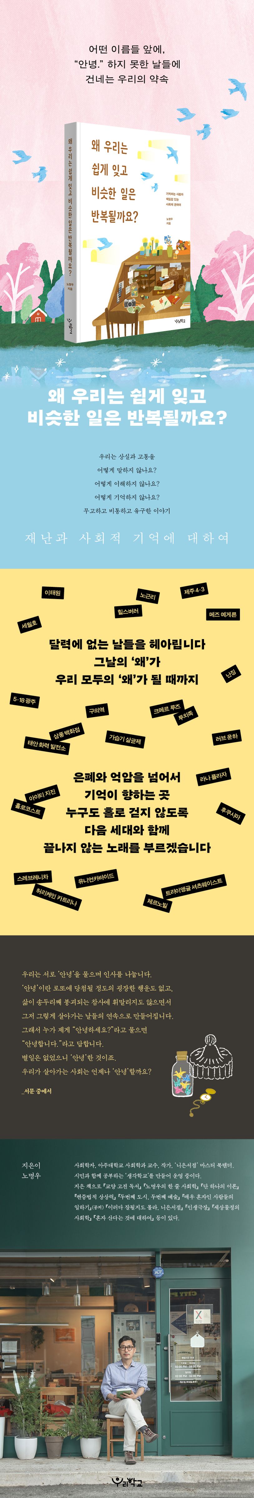 일상적 재난의 시대, 안전한 삶과 세계를 위해 ‘사회적 기억’의 의미를 깊이 그리고 기꺼이 탐색하는 책이 출간되었다. 이 책은 여기에 있었으나 돌아오지 못한 무수한 이들, 재난이 앗아간 무고한 이름들에 노란 리본을 다는 마음으로 우리 사회의 ‘안녕’을 다시 묻는다.