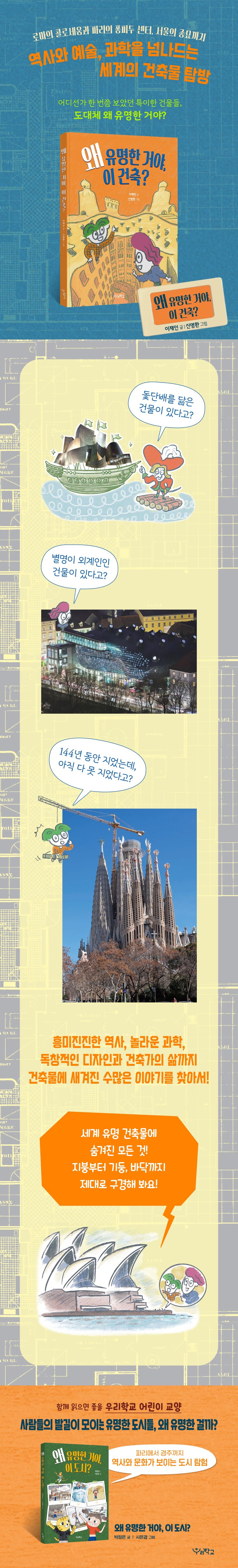 어린이 교양도서 ‘왜 유명한 거야’ 시리즈의 신간 『왜 유명한 거야, 이 건축?』이 출간되었다. 이 책은 세계적으로 유명한 10가지 건축물의 예술적, 실용적 가치와 건축사적 의미를 어린이 눈높이에서 흥미롭게 소개한다.