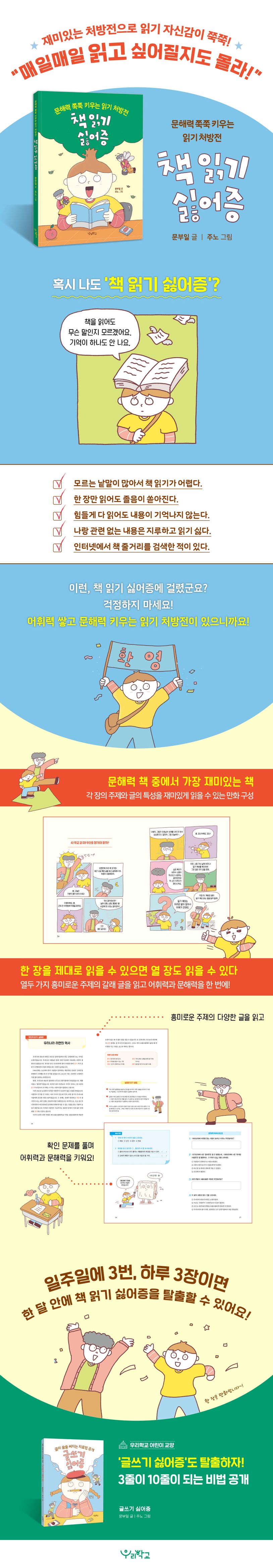 『책 읽기 싫어증』은 설명문, 논설문, 방송 기획서, 희곡 등 초등 교과에서 다루는 주요 갈래 글을 아이들의 관심사나 관련 주제로 저자가 새롭게 집필한 뒤 어휘력과 독해력을 쌓을 수 있도록 구성한 책이다. 또 책 읽기를 싫어하는 독자라면 깊이 공감할 수 있는 만화를 담아 읽기 페이지로 들어가는 부담을 낮췄다. 이 책으로 독자들은 그간 어려워서 지루해서 피하기만 했던 책 읽기에 가까이 다가갈 수 있을 것이다.