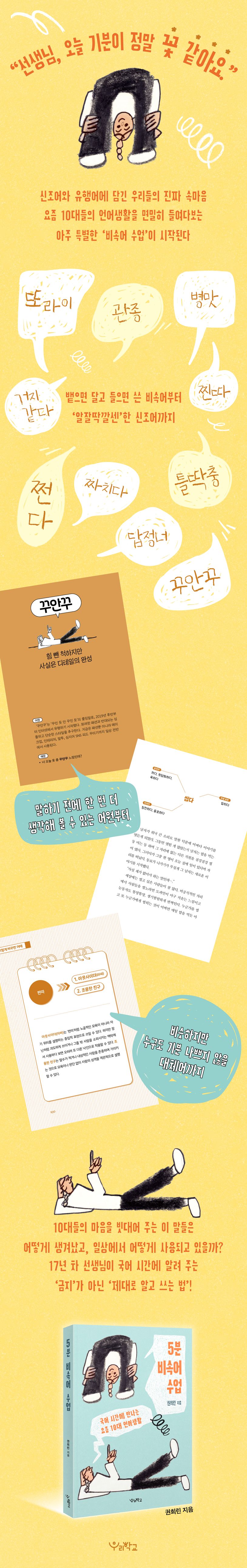 요즘 청소년들은 어떤 말을 자주 쓸까? 17년간 학교 현장에서 10대들의 언어생활을 탐구하며, 국어 수업 시간 중 5분을 내어 ‘비속어 수업’이라는 흥미로운 수업을 진행해 온 교사 권희린이 그 경험을 담아 「5분 비속어 수업」을 냈다.