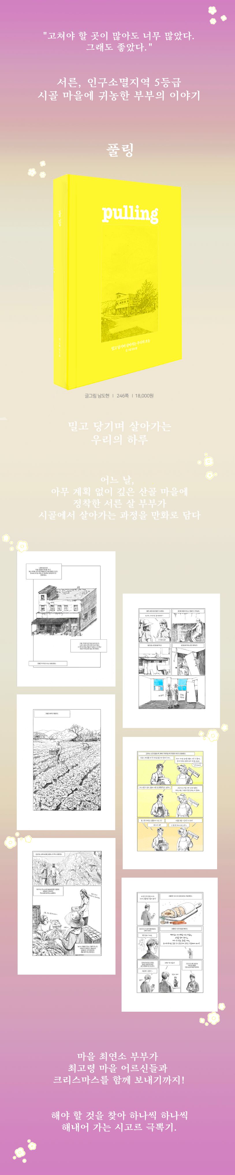 지방소멸, 러스틱라이프, 5도2촌, 관계인구, 빈집문제등 하루가 멀다하고 뉴스에서는 지방의 위기에 관해 이야기한다. 청년 유입을 목표로 각종 제도 또한 쏟아진다. 그렇다면 진짜 지방 오브 지방. 시골 오브 시골에서 살아가는 서른살 부부의 하루는 어떨까? 50여가구가 사는 인구소멸등급 고위험인 5등급! 이 작은 시골 마을에 부부가 귀촌했다. 만화 〈풀링〉은 골프장 일용직부터 시작해 집수리, 담배가게, 유기농 농사, 그리고 시골 작은 카페 ‘농부부 구판장’을 만들기까지 청춘 부부의 기록을 솔직담백하게 담았다.