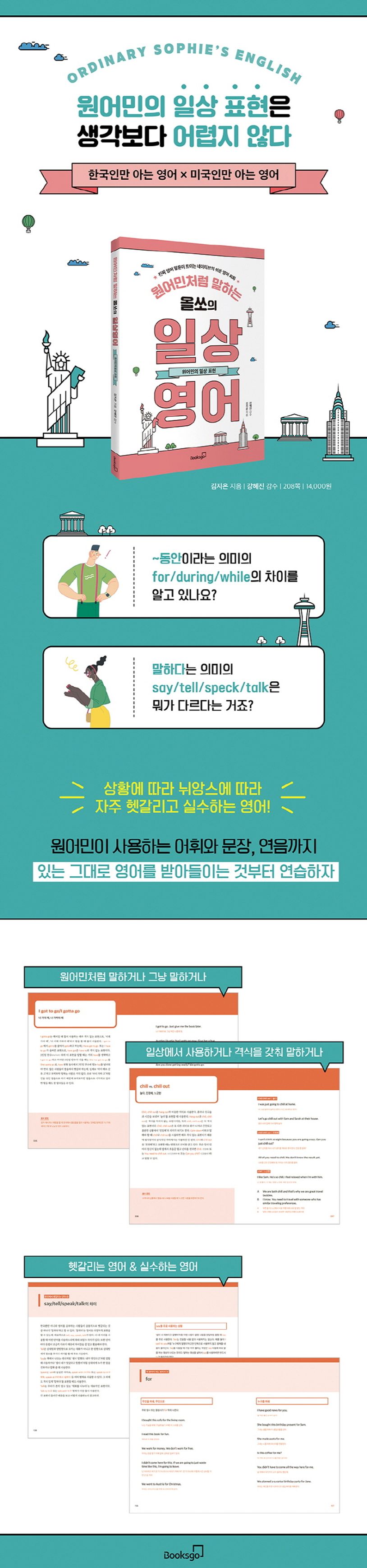 영어를 공부하면서, 원어민이 아주 가끔씩 쓰는 복잡하고 어려운 문장 구조는 굳이 배울 필요가 없다. 원어민이 반복해 말하는 쉬운 문장 구조를 머릿속에 탑재할 수만 있다면, 내가 이미 알고 있는 쉬운 단어만 쏙쏙 넣어 내 생각을 바로 말할 수 있다. 또한 원리를 알기 때문에 영어의 말하기, 듣기도 훨씬 쉬워진다. [원어민처럼 말하는 올쏘의 일상 영어 - 원어민의 일상 표현]은 원어민이 매일 쓰는 그들의 일상 표현을 담은 예문을 통해 영어를 쉽게 배울 수 있도록 구성하였다. 또한 한국인에게 영어가 어려울 수밖에 없는 이유와 이를 극복하는 쉽고 재미있는 설명으로 영어를 이해하고 말하는데 익숙해질 수 있도록 하였다. ‘영어’를 포기하는 일이 없도록 영어의 흥미를 놓치지 않고 영어를 쉽게 말할 수 있도록 하였다.