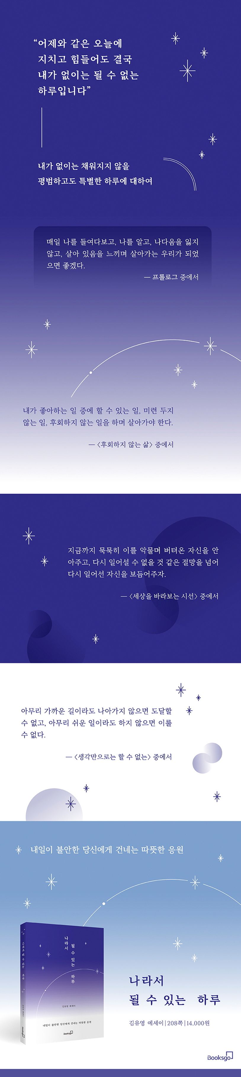 [나라서 될 수 있는 하루]에서는 지나온 어제를 어떻게 후회 없이 보내야 하는지, 오늘의 나는 어떻게 나다움을 지키며 걸어야 하는지, 다가올 내일 앞에서 불안함을 떨치며 어떻게 나아가야 하는지에 대해 이야기한다. 일상의 사소하고 평범한 지점들을 새롭고 특별하게 바라보는 저자 김유영의 시선을 따라가다 보면 하루의 무거움이 조금은 가벼워질 것이다. 그리고 하루 끝에서 소중한 당신에게 ‘나’였기에 될 수 있는 하루를 보내느라 수고했고, 고마웠다는 말 한마디를 건네줄 수 있다면 좋겠다.