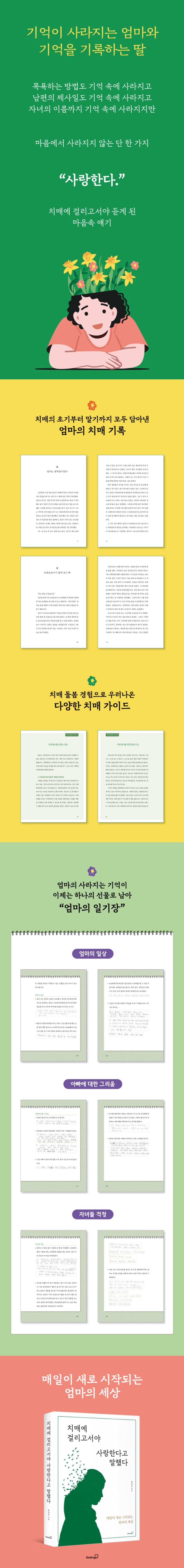 기억을 잃어가는 엄마의 엄마가 된 이후로 간병의 모든 과정은 순탄하지 않았고, 후회하고 아쉬웠던 순간만 늘어간다. 이런 모든 순간을 솔직하게 담아낸 이 책이 또 다른 치매 환자와 그 가족에게 위로가 되기를 바라며, 일상의 기록뿐만 아니라 치매 돌봄의 정보까지 도움이 되길 바란다.