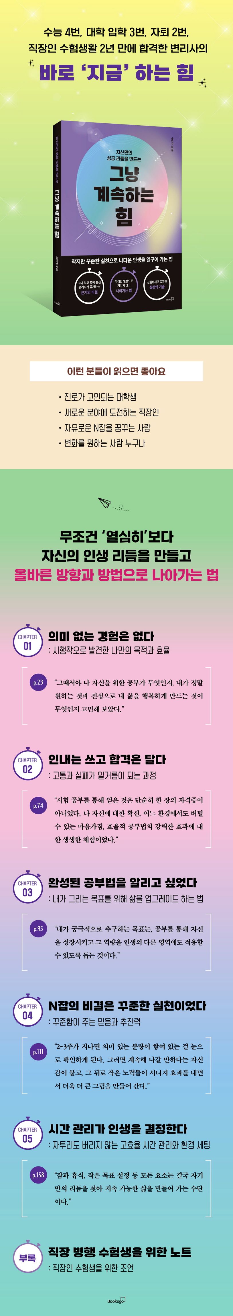 《그냥 계속하는 힘》에서는 과거 저자의 적나라한 시행착오와 함께, 순도 100%의 소소하지만 강력한 행동 방식을 제시하고 있다. 자신이 진정으로 원하는 목표를 설정하여 실천에 당위성을 부여하고, 이를 뒷받침하는 체계적인 시간, 환경 및 멘탈 관리를 통해 누구나 지속 가능하면서도 효과적인 실천의 로드맵을 제시한다. 특히 실천의 방법을 쉽고도 세세하게 소개하여, 독자들이 공감하고 직접 적용해 볼 수 있는 한편 시간 낭비 없이 목표에 가장 효율적으로 도달하도록 돕고 있다.