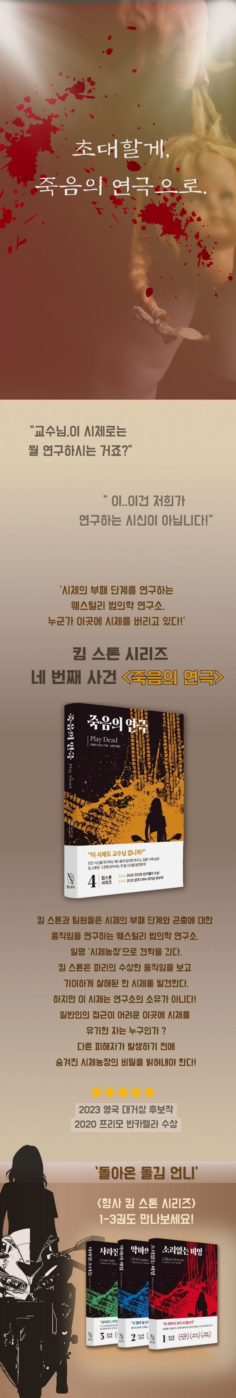 형사 킴 스톤 시리즈 중에서도 〈죽음의 연극〉은 높은 흥미도와 작품성으로 2020년 이탈리아에서 반카렐라 상을 수상했으며, 2023년 영국에서 가장 명망 있는 추리/미스터리 소설 상인 CWA 대거상 후보에 올랐다. 1~3권을 통해 이미 킴 스톤의 매력에 빠진 독자들은 그녀의 과거와 관련된 새로운 사실들을 알고 더욱 깊은 ‘킴 스톤 앓이’를 하게 될 것이며, 아직 킴 스톤을 모르는 독자들 또한 충격적 반전과 손에 땀을 쥐게 하는 플롯을 자랑하는 〈죽음의 연극〉을 시작으로 이 시리즈에 부담 없이 입문할 수 있다.