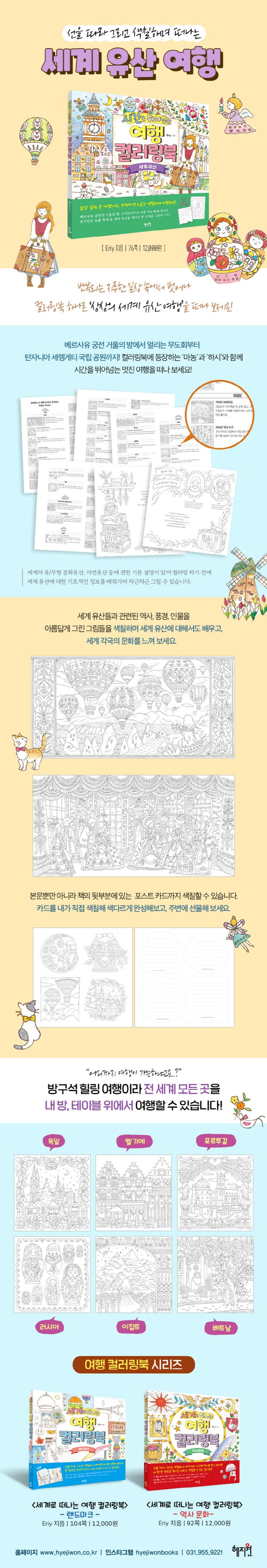 베르사유 궁전의 거울의 방, 웨스트민스터 궁전의 시계탑, 체코 모라비아 지방의 왕들의 기마행렬, 중국의 푸젠토루 등 세계의 유·무형 문화유산, 자연유산 등을 다양하게 담고 있어요. 세계 유산들과 관련된 역사, 풍경, 인물을 아름답게 그린 그림들을 색칠하며 세계 유산에 대해서도 배우고, 세계 각국의 문화를 느껴 보세요.
