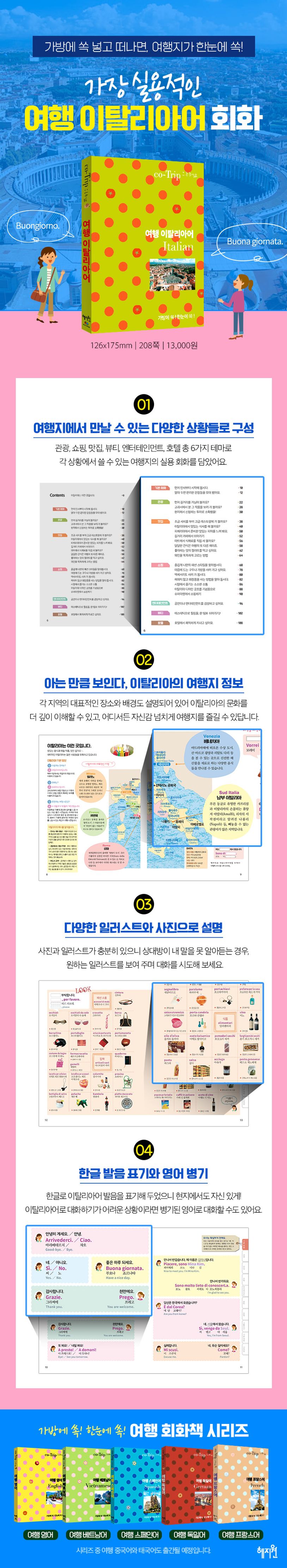 여행에 필요한 언어뿐만 아니라 로마, 피렌체, 밀라노 등의 다양한 관광지 정보를 담았어요. 각 지역의 대표적인 장소와 배경도 설명되어 있어 이탈리아의 문화를 더 깊이 이해할 수 있고, 어디서든 자신감 넘치게 여행지를 즐길 수 있답니다.