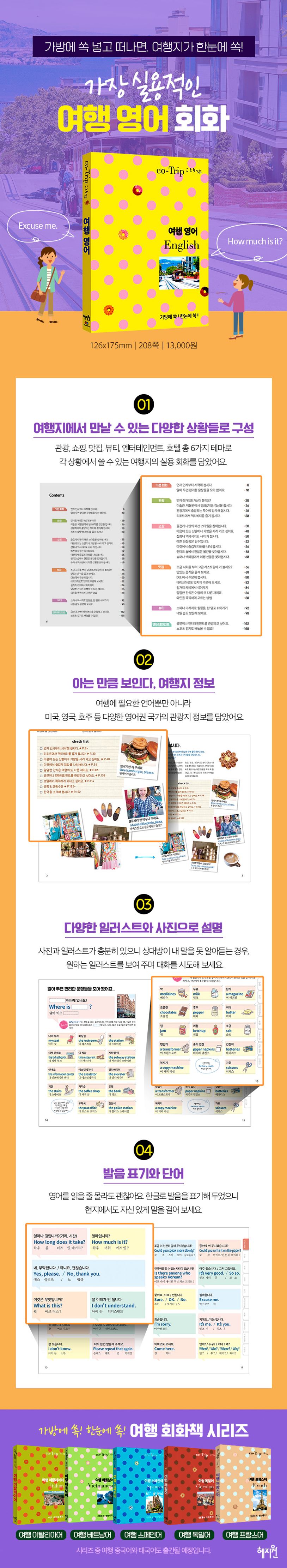 관광, 쇼핑, 맛집, 뷰티, 엔터테인먼트, 호텔 총 6가지 테마로 각 상황에서 쓸 수 있는 여행지의 실용 회화를 담았어요. 공항 이용, 대중교통 이용, 환전, 택배 발송 등의 상황들도 다양하게 다루고 있으니 필요한 상황에 가방에서 쏙 꺼내서 바로 펼쳐볼 수 있어요.