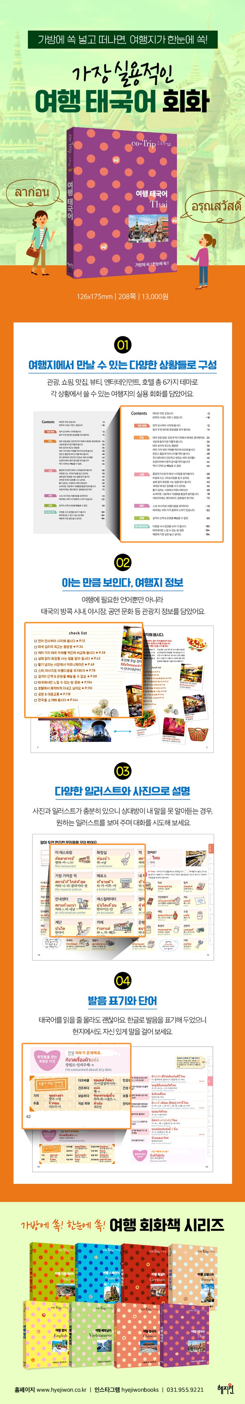 여행에 필요한 언어뿐만 아니라 방콕, 치앙마이, 푸껫 등의 다양한 관광지 정보를 담았어요. 각 지역의 대표적인 장소와 배경도 설명되어 있어 태국의 문화를 더 깊이 이해할 수 있고, 어디서든 자신감 넘치게 여행지를 즐길 수 있답니다.