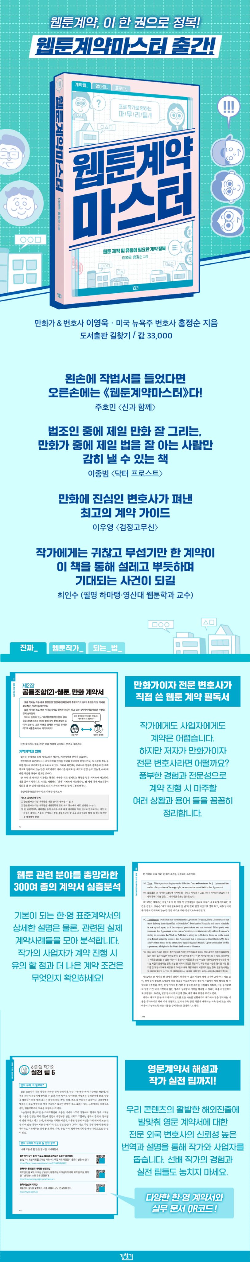 우리 웹툰을 비롯한 다양한 콘텐츠가 세계적으로 주목을 받으면서 해외 서비스 또한 활발해지는 요즘, 본 책은 각종 영문계약서에 대한 전문 외국변호사의 신뢰성 높은 번역과 설명을 제공함으로써 작가와 사업자를 돕는다. 또한 선배 작가의 경험과 진심이 담긴 실전 팁들은 독자들에게 유용한 정보를 넘어 든든한 응원이 되어 줄 것이다.