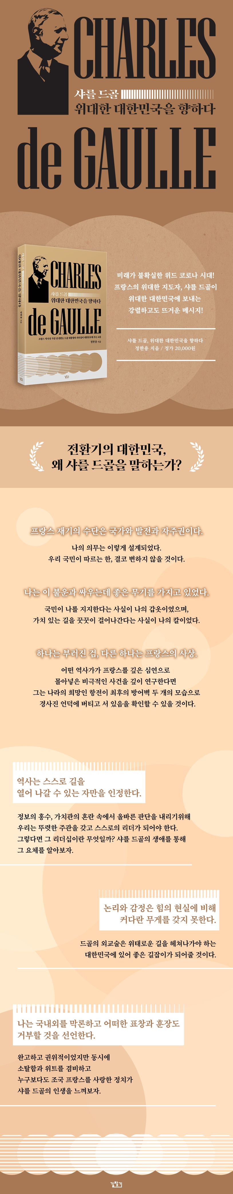 왜 샤를 드골인가? 2019년 11월에 발생하여 현재까지 이어지고 있는 코로나 판데믹, 그리고 2022년 2월에 러시아의 침공으로 시작된 러시아-우크라이나 전쟁으로 인해 발생한 인플레이션과 식량 위기는 전 세계의 경제를 뒤흔들고 있다. ‘한 치 앞을 볼 수 없다.’ 라는 말이 단순한 수사적 표현이 아니라 실제 상황을 나타내고 있는 시대인 것이다. 냉정한 이성을 유지하면서 현 상황을 파악하고, 할 수 있는 일과 해야 할 일을 명확히 인식하여 실행해야 하는 지금, 서방 진영에 속해 있으면서도 나토와 공산권 사이에서 프랑스의 목소리를 내고 프랑스의 이권을 끝까지 지켜낸 샤를 드골의 리더십을 따라야 할 때라 할 수 있지 않을까.