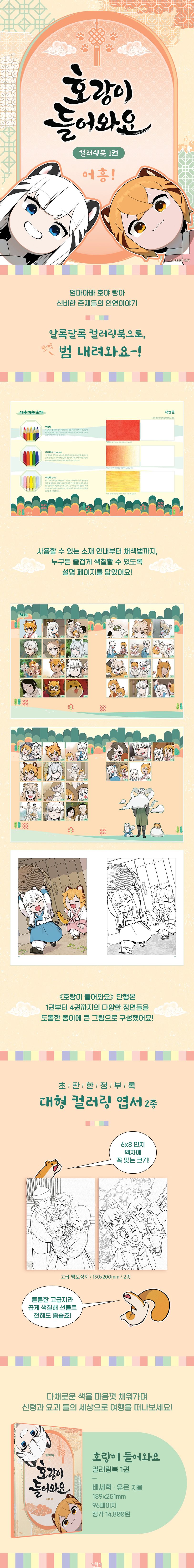 귀염뽀짝 친구들을 내 손으로 더 귀엽게 칠할 수 있다고?! 호야, 랑아와 친구들의 귀여운 일상 묘사로 많은 사랑을 받고 있는 인기 웹툰 ‘호랑이 들어와요’. 이번에는 컬러링북으로 돌아왔다. 엄마, 아빠와의 첫 만남부터, 마을 나들이, 그리고 도깨비 허찬 삼촌, 담비, 구미호 설화와의 좌충우돌+요절복통 해프닝까지. 웹툰으로만 만나던 귀여운 친구들에게 이제 색연필, 크레파스, 사인펜 등을 사용해 새로운 생명을 불어넣어 보자. 왼쪽 페이지에는 웹툰 원화, 오른쪽 페이지에는 선화를 배치했으며 쫙 펼쳐지는 특수 제본으로 더욱 편리하게 색칠놀이를 즐길 수 있다. 자, 나만의 다채로운 색과 함께 신령과 요괴 친구들의 즐겁고 신묘한 세상으로 여행을 떠나보자!!