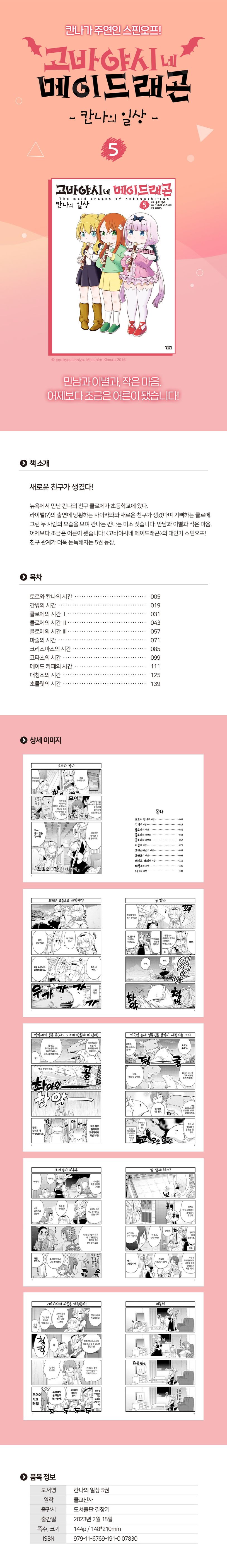 뉴욕에서 만난 칸나의 친구 클로에가 오보로즈카 초등학교에 찾아왔습니다! 라이벌(?)의 출연에 당황하는 사이카와와 새로운 친구가 생겼다며 기뻐하는 클로에. 그리고 두 사람의 모습을 보며 칸나는 미소 짓네요. 만남과 이별과 작은 마음. 어제보다 조금은 어른이 된 느낌입니다! 고바야시네 메이드래곤 대인기 스핀오프! 친구 관계가 더욱 돈독해지는 칸나의 일상 5권 등장.