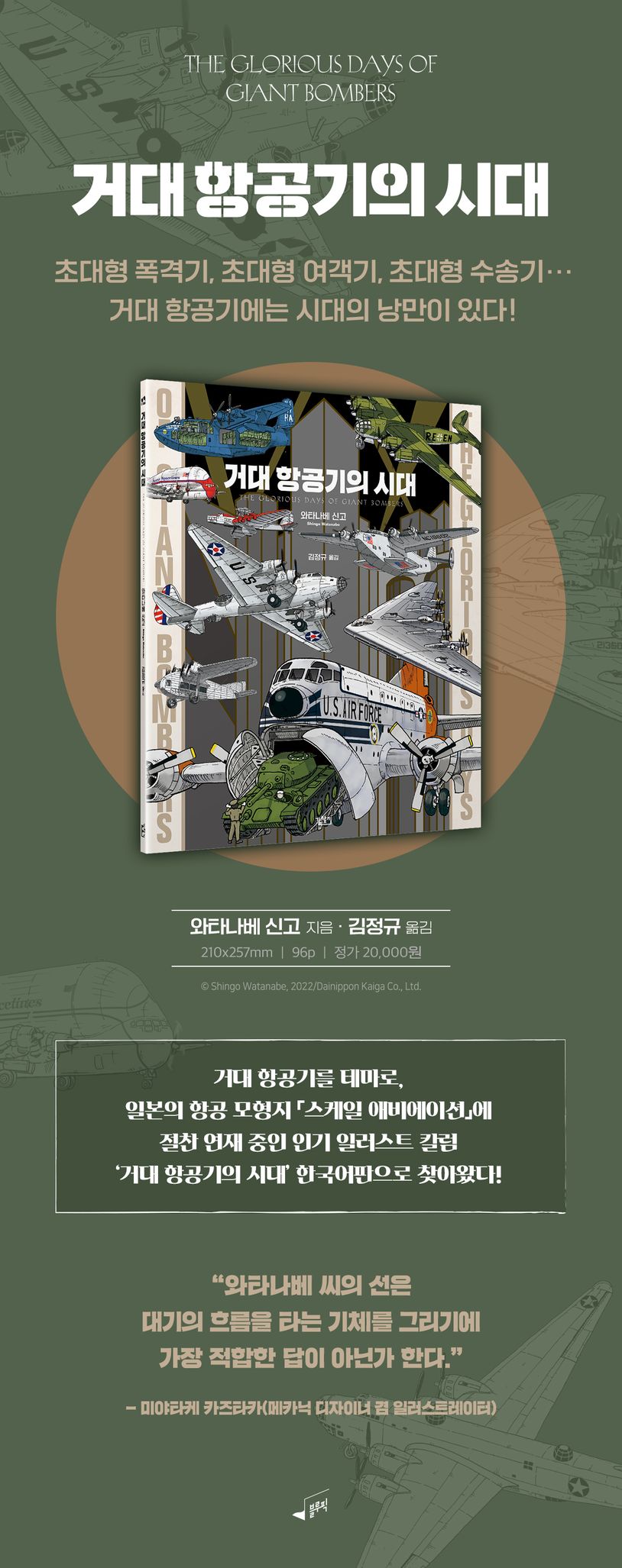 일본의 항공 모형 전문지인 격월간 『스케일 애비에이션』에 연재된 일러스트 칼럼인 「巨人幾の時代」를 단행본으로 엮은 『거대 항공기의 시대』는 100년이 넘는 인류의 항공사에서 나름의 큰 족적을 남긴 다수의 거대 항공기들을 부드럽고 유머러스하면서도 섬세한 터치로 각각의 독특한 기계적 구조와 함께 개발 과정 및 운용 중에 있던 에피소드를 그려내고 있다. 항공기 및 항공 일러스트 팬에 있어 이 책은 가슴 속에 남아있던 어린 시절 창공에 대한 꿈을 다시 떠오르게 하는 좋은 선물이 될 것이다.