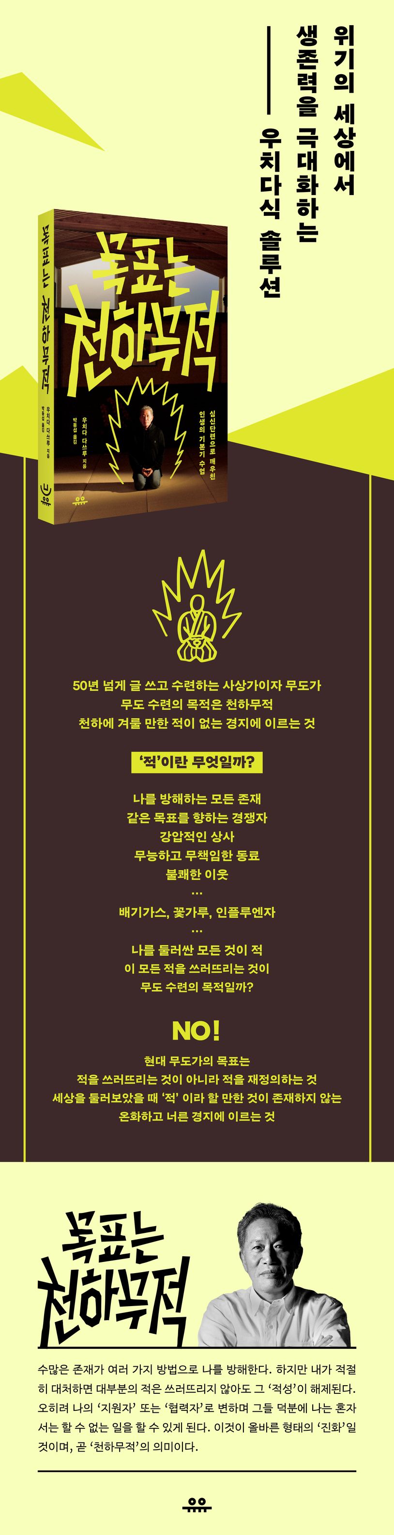 무도는 수련의 방편이기에 기본적으로 적이 나를 공격해 오는 상황을 전제한다. 어떠한 위기 상황에서도 살아남을 수 있는 힘을 기르는 것이 수련이 목표이다. 우치다 다쓰루는 20대 때부터 철학 공부와 무도 수련을 병행하며 철학과 무도 사이의 공통점을 발견했다. 둘 다 삶을 지탱하는 지혜, 살아남는 힘을 기르는 데 도움이 된다는 것. 선생은 그간 여러 저서를 통해 바로 이 깨우침을 역설해 왔다. 책상머리 공부만으로는 다질 수 없는 인생의 기본기가 있고, 스포츠로서의 무술만 연마해서는 결코 깨우칠 수 없는 기지와 감각이 있다는 것. 이 책은 그 ‘무도론’, 우치다 다쓰루의 ‘무도적 사고’를 집대성한 책으로 예측 불허의 위기 사회에서 생존력을 극대화하는 그만의 해법과 통찰을 전한다.