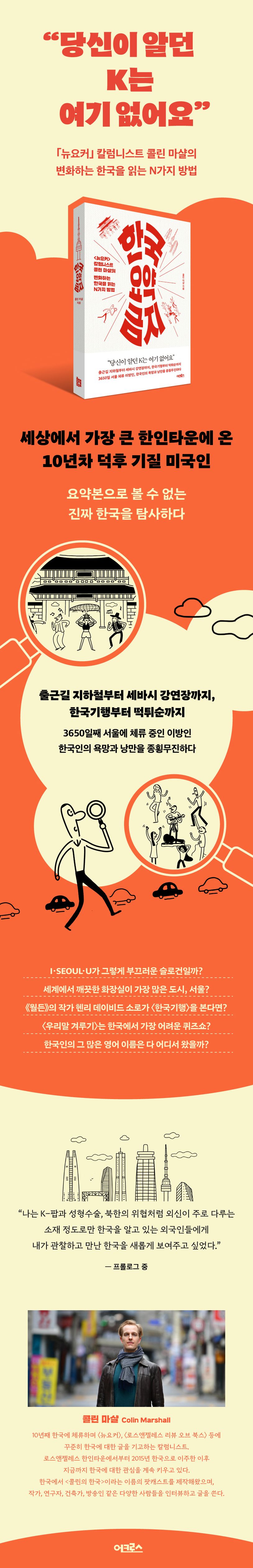 서울에 3650일째 거주하며 〈뉴요커〉와 〈로스앤젤레스 리뷰 오브 북스〉의 칼럼니스트로 활동하고 있는 콜린 마샬이 말한다. “당신이 알던 K는 여기 없어요.” ‘한국의 코로나19 대응이 주는 위안’, ‘〈강남스타일〉이 열어젖힌 문’이라는 글을 기고하며 한국을 향한 전 세계의 호기심과 궁금증을 해소해줬던 그는 ‘한국에는 똑같은 고층 아파트가 사방에 즐비하다’거나, ‘한국인은 모두 우울하다’는 등의 겉핥기식 관찰과 단정적인 시선으로 볼 수 없는 진짜 한국을 탐사한다.