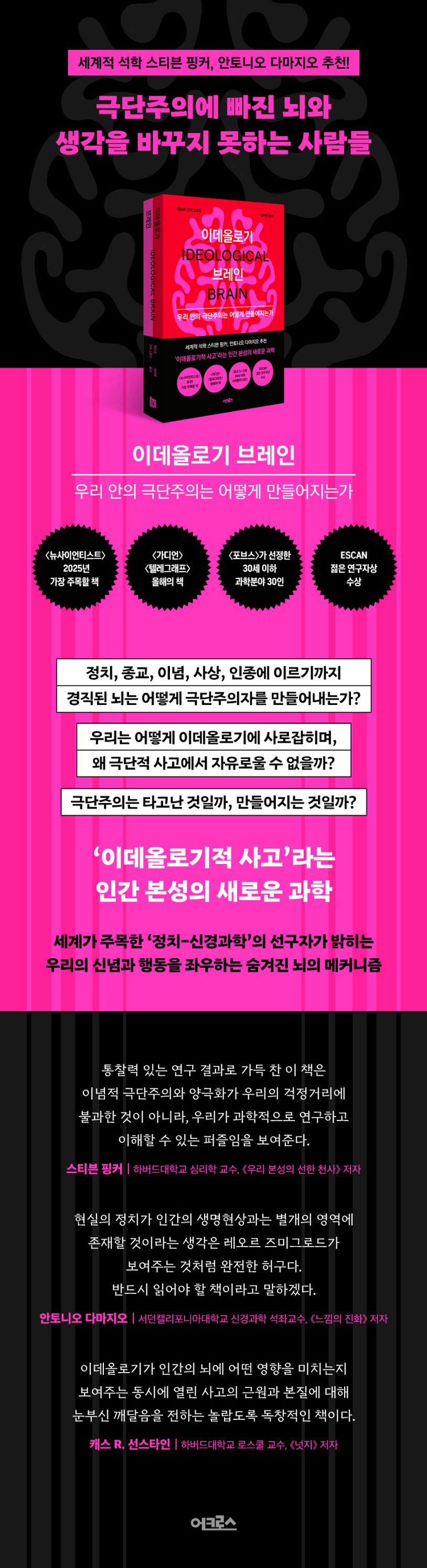 저자는 실험심리학, 인지과학, 신경과학의 방법론을 사용하여 정치적 신념이 외부 환경에 의해 형성되는 단순한 사회적 산물이 아니라, 우리의 뇌에 침투하여 신경 구조와 세포 차원까지 연결된다는 놀라운 사실을 보여준다. 그는 생물학과 환경 사이의 복잡한 상호작용을 통해 극단주의의 영향을 받을 잠재력이 있는 사람이 누구인지, 다시 말해 어떤 뇌가 이념적 사고에 특별히 취약하고 또 어떤 뇌가 유연하며 자유롭게 사고할 수 있는지 그 이유를 조명한다.