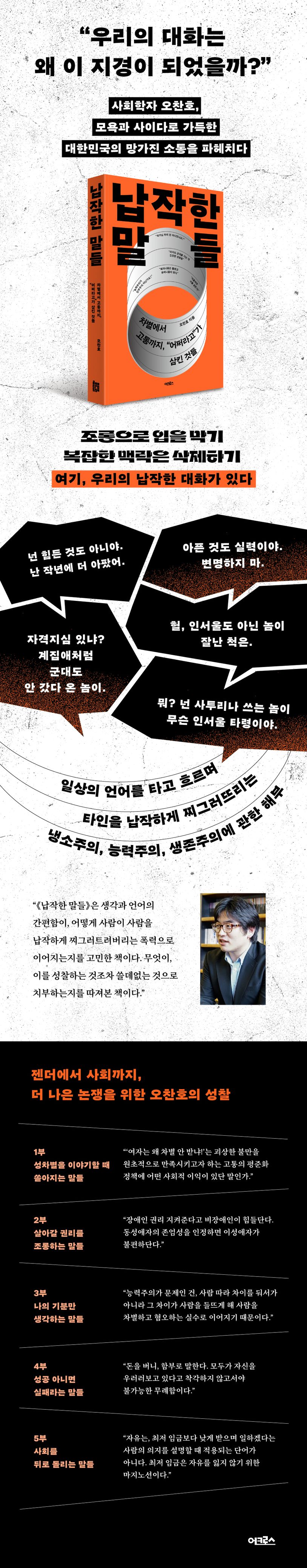 베스트셀러《우리는차별에찬성합니다》이후우리사회의민낯을용감하게응시해왔던사회학자오찬호가신작《납작한말들》로돌아왔다.오찬호는작가로활동하면서목격하고체험했던한국사회의풍경들을묘사한다.빈부격차에대한지적에돌아오는“북한에가라”라는빈정거림.비정규직의처우개선요구에돌아오는“그런일하라고누가칼들고협박했냐”라는조롱.복잡한사회적맥락들이삭제되고,모욕으로상대의입을막는대한민국의망가진공론장이오찬호특유의날카로운시선속에서적나라하게드러난다.