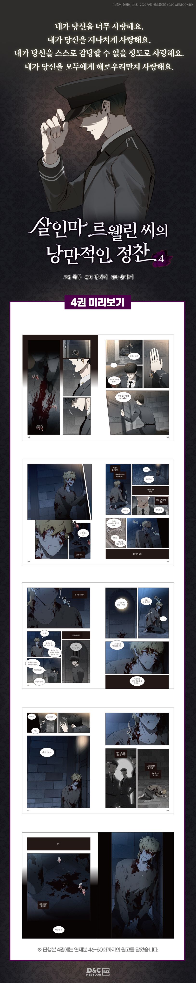 2020년 6월부터 2022년 2월까지, 리디에서 많은 독자분들의 사랑 속에 연재된 웹툰 〈살인마 르웰린 씨의 낭만적인 정찬〉이 완결 후 종이책으로 출간되었습니다. 총 6권 완결이며, 묵부 작가님의 섬세한 작화와 영리터 작가님의 흥미진진한 연출이 종이책 페이지 안에 새롭게 재구성되어, 독자분들께 웹툰과는 또 다른 신선함과 즐거움을 선사할 것입니다.