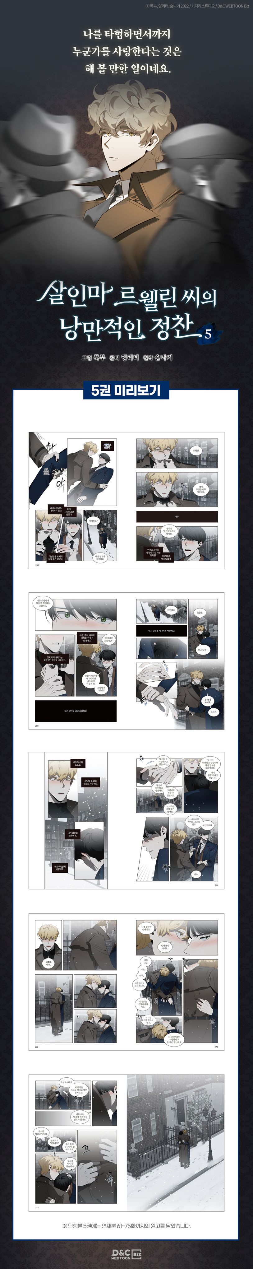 2020년 6월부터 2022년 2월까지, 리디에서 많은 독자분들의 사랑 속에 연재된 웹툰 〈살인마 르웰린 씨의 낭만적인 정찬〉이 완결 후 종이책으로 출간되었습니다. 총 6권 완결이며, 묵부 작가님의 섬세한 작화와 영리터 작가님의 흥미진진한 연출이 종이책 페이지 안에 새롭게 재구성되어, 독자분들께 웹툰과는 또 다른 신선함과 즐거움을 선사할 것입니다.