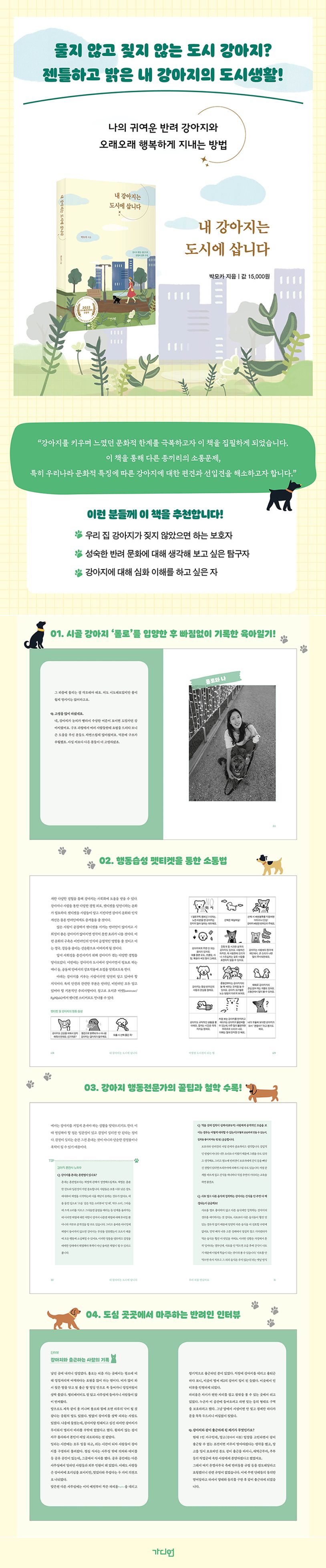 시골에서 입양한 진도믹스 ‘롤로’를 키우는 저자는 강아지를 키우며 느꼈던 문화적 한계를 극복하고자 이 책을 썼습니다. 시골에서 마음껏 뛰어놀아야 할 도시의 모든 강아지가 좁은 집 안에서 과연 주인과 얼마나 행복하게 살고 있을까를 고민했습니다. 롤로를 키우며 적었던 육아일기에 그 경험을 빠짐없이 저장했습니다. 저자는 서로가 소통법을 이해하고 차이점을 안다면 사람과 강아지가 공존하는 평화로운 동산을 만들 수 있다고 믿습니다. 『내 강아지는 도시에 삽니다』는 복잡한 도시에서 반려인과 비반려인 모두 공존하는 방법을 고민하며 해결책을 담아낸 모든 반려인을 위한 소중한 기록입니다.