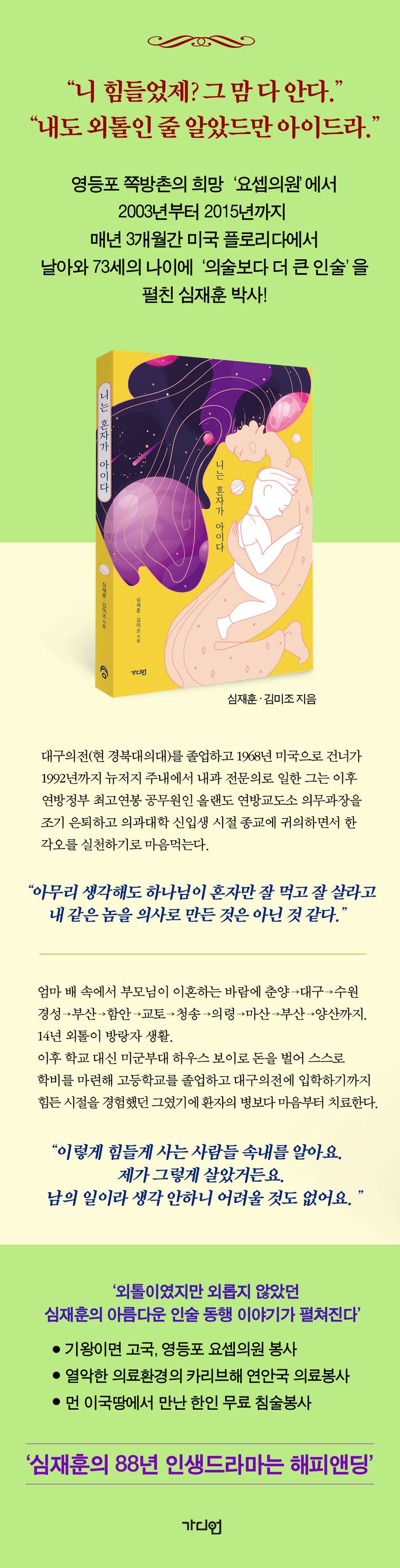 현재 88세인 그는 미국에서 의사로 성공적인 삶을 살았고, 자녀, 며느리, 사위, 손자에 이르기까지 11명의 박사를 둘 만큼 자식 농사도 잘 지어 해피엔딩 인생을 만들어가고 있다. 하지만 그의 어린 시절은 지독한 외톨이였다. 엄마 배 속에 있을 때 부모가 이혼하는 바람에 춘양→대구→수원→경성→부산→함안→교토→청송→의령→마산→부산→양산까지 친인척 집을 전전해, 삶의 조각을 모조리 이어 붙여도 부모와 함께한 시간은 3년도 채 되지 않을 만큼 외로운 방랑자였다. 그렇게 정처 없는 떠돌이로 일제 강점기를 보낸 그가 해방 이후 선택한 곳은 학교 대신 미군부대 하우스보이. 이 일로 스스로 학비를 마련해 고등학교를 졸업하고 대구의전에 입학하기까지도 방황의 연속이었다. 그런 그를 나락에서 끌어올린 것은 하나님, 마치 허허벌판 광야에 홀로 버려진 것 같았던 그가 삶의 중심을 잡고 의사로서 살아갈 수 있게 된 것은 종교의 힘이었다고 고백한다. 의과대학 신입생 시절 마음먹은 의료봉사를 칠순을 넘긴 나이에 실행에 옮기면서 요셉의원에 밀려드는 환자를 보살피는 일은 쉽지 않았지만, 자신이 일어섰던 절실한 마음으로 환자를 살폈다.