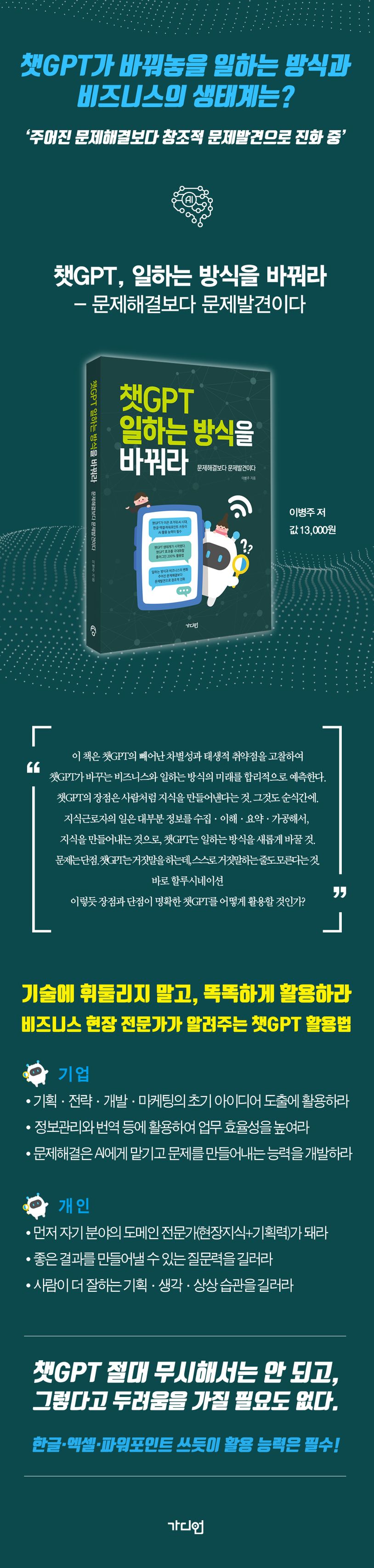그래서 저자는 챗GPT를 무시해서는 안 되지만 그렇다고 두려움을 가질 필요도 없다고 말한다. 챗GPT의 장단점을 알고 ‘한글·엑셀·파워포인트 쓰듯 똑똑하게 활용하면 된다. 핵심은 문제해결은 챗GPT에 맡기고 문제를 발견하는 능력을 갖는 것이다.’ 이것이 비즈니스 현장 전문가만이 알려줄 수 있는 인사이트다. 챗GPT가 바꿔놓을 비즈니스 생태계에서 혼란스러운 우리에게 이 책은 군더더기 없는 길잡이가 될 것이다.
