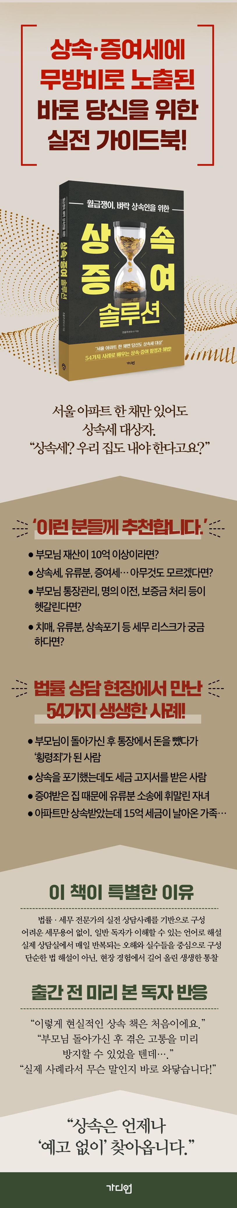 돌아가신 부모님을 슬퍼할 겨를도 없이 날아든 ‘상속세 폭탄’과 ‘형제 싸움’에 당혹스러워하는 당신을 위한 실전 가이드북이다. 준비 없는 상속이 얼마나 위험한지는 ‘갑자기’ 상속을 맞이해본 사람은 절감한다. 《상속·증여 솔루션》은 예고 없이 찾아온 세금폭탄, 형제자매 간의 유류분 분쟁, 치매 부모님의 통장인출로 인한 형사처벌 가능성까지… 실제 법률·세무 상담현장에서 길어낸 54가지 사례로, 상속·증여 과정에서 발생하는 가장 실제적인 분쟁, 낭패, 절세 전략을 쉽고 현실감 있게 설명한다. 특히 사례별로 ‘상속세 요약/주의사항/핵심 교훈’까지 정리되어 있어, 지식 없이도 필요한 상황에 바로 적용이 가능하다.