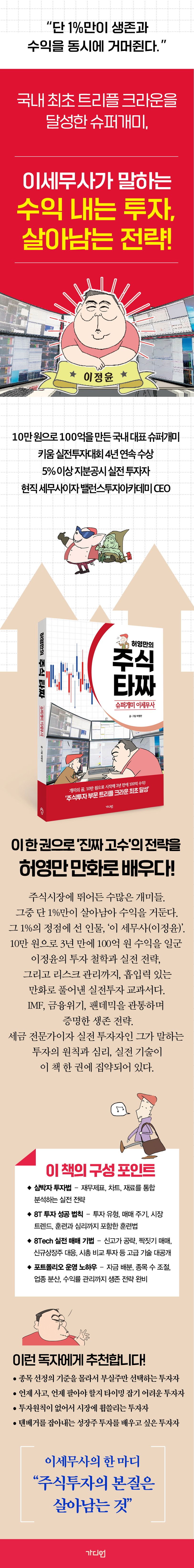 주식 타짜의 투자 철학과 삶의 궤적을 직접 발로 뛰며 깊이 있게 취재해, 이를 만화라는 장르 속에 실전감 넘치게 녹여낸 허영만 화백과 함께라면 어려운 ‘주식 투자전략’, 탐욕과 공포의 ‘투자 심리’, ‘상승장과 하락장 대처법’까지 흥미롭게 몰입하면서도 핵심을 정확히 이해하게 된다.