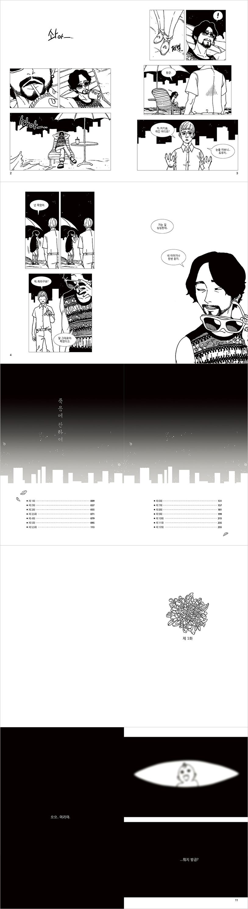 2012년 네이버에서 연재를 시작한 〈죽음에 관하여〉는 생사의 갈림길에서 벌어지는 일들을 옴니버스 식으로 전개하는 작품이다. 만물이 반드시 거쳐야 할 마지막 관문인 죽음을 통해 역설적으로 삶의 소중함을 깨닫게 하며, 매 회 독자들에게 호평을 받아왔다. 철학적인 주제뿐만 아니라 에피소드마다 매력적인 인물과 대사, 허를 찌르는 반전, 탄탄한 구성으로 작품의 저력을 보여줬다. 또한, 꾸준히 많은 독자에게 ‘인생 웹툰’으로 꼽히며 2018년 네이버에서 재연재를 시작했다. 〈죽음에 관하여〉 스페셜 에디션은 애독자들에게는 소장 가치가 충분한 선물이며, 작품을 충분히 음미할 수 있는 감동을 선사할 것이다.