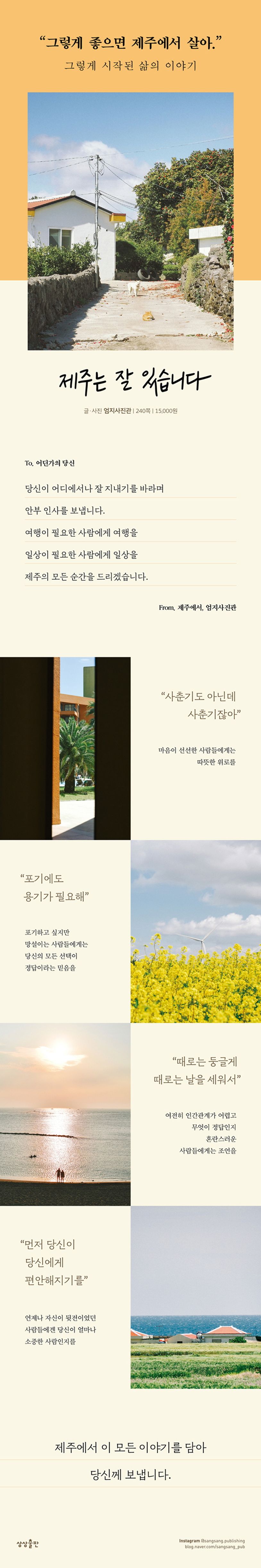 일상은 여행 같고 여행은 일상 같다. 누군가가 여행으로 오는 곳에서 일상을 살아가는 사람이 있다. 그래서인지 제주에서의 삶은 유독 여행과 일상이 밀접하게 연결되어 있다는 생각도 든다. 따라서 《제주는 잘 있습니다》는 일상과 여행 사이의 삶 속에서 자신답게 살아가는 것이 얼마나 중요한지를 알려줄 것이다.